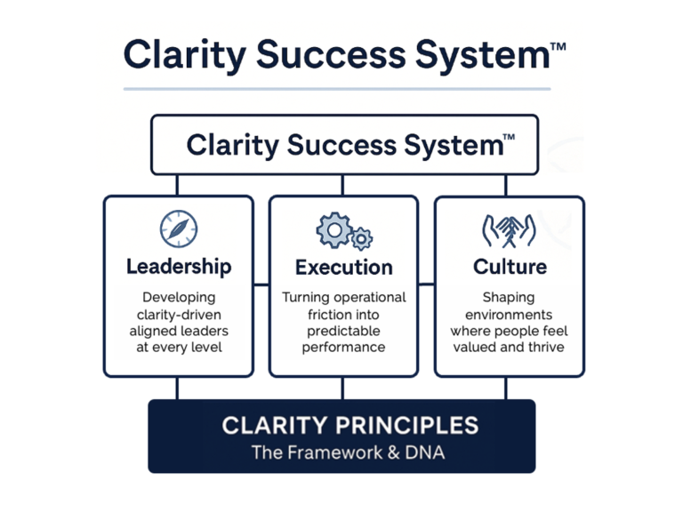 Each engagement draws from the Clarity Success System™: a field-tested structure designed to help growth-minded organizations scale leadership, streamline operations, and create a culture of ownership.